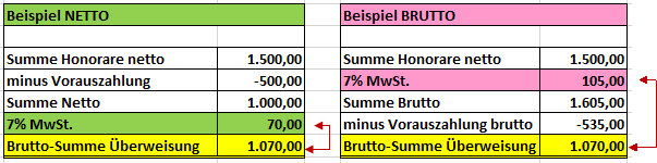 - Für umsatzsteuerpflichtige Autoren im Inland: Wurden Vorauszahlungen als Nettobetrag von den Netto-Lizenzerlösen abgezogen und erst dann (so ist es korrekt) die MwSt. mit dem betreffenden Brutto-Zahlbetrag ausgewiesen – oder wurde von der Bruttosumme Lizenzen die Bruttosumme der Vorauszahlung abgezogen? Bei der Bruttomethode stimmt nämlich die ausgewiesene MwSt. nicht mit der aktuellen Zahlung überein und ist daher steuerlich nicht korrekt. Siehe dazu folgendes Beispiel: