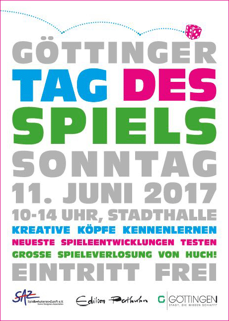 Am Sonntag ist die Veranstaltung öffentlich und wandelt sich zum Göttinger Tag des Spiels, bei dem alle Spielbegeisterten herzlich in die Stadthalle eingeladen sind, um mit den Spieleautorinnen und Spieleautoren zwischen 10 und 14 Uhr deren noch unveröffentlichte Spiele zu testen.