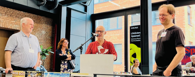 Direkt im Anschluss wurde der Göttinger Spatz verliehen. Die Auszeichnung für seinen Beitrag zum Kulturgut Spiel ging in diesem Jahr an Bruno Faidutti. Der französische Autor behandelte in seinem Blog viele interessante Themen, belebte international den Diskurs in der Autorenschaft und engagierte sich in der Société des Auteurs de Jeux (Interessenvertretung der Spieleautoren in Frankreich). Die Laudatio hielt der Preisträger des letzten Jahres Hilko Drude.