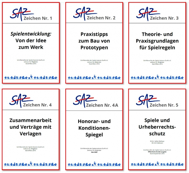 - Die Schriftenreihe SAZ-Zeichen beinhaltet das Grundwissen für Spieleautor*innen und steht allen Mitgliedern exklusiv zum Download zur Verfügung – siehe Titelübersicht. Außerdem informiert ein Newsletter regelmäßig über aktuelle Themen.